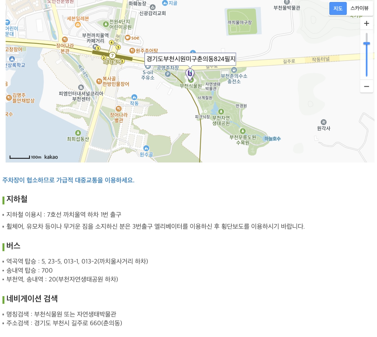 - 지하철: 1호선 부천역 하차 후 52번, 53번 버스 이용