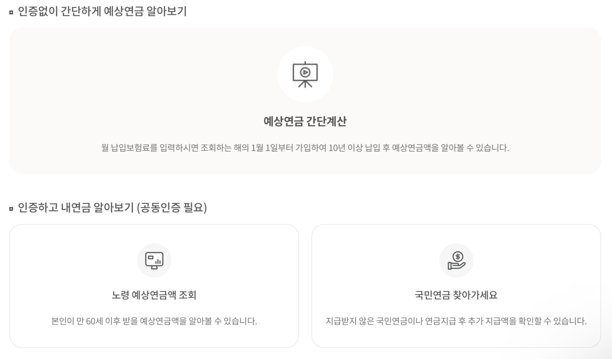 | 연금 수급 자격 확인 | 무료 | 미래 수급 가능성 및 시기 파악 가능 |