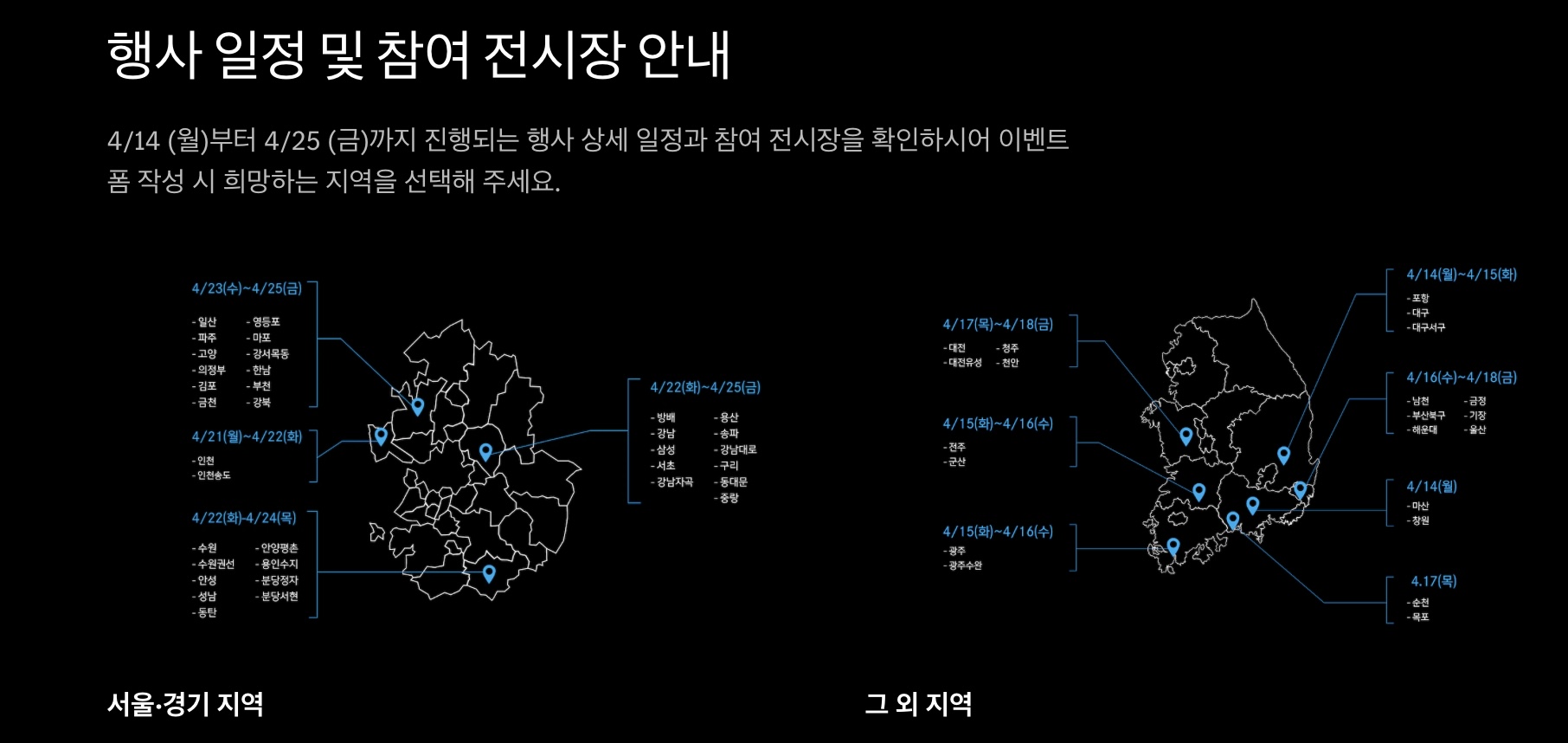 서울, 부산, 제주, 강원(평창), 경기(용인), 대구, 광주 등 전국 주요 7개 지역에서 진행됩니다. 각 지역별 특색 있는 드라이빙 코스와 함께 봄의 아름다움을 만끽하세요.
