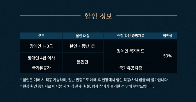 | 가족 패키지 (4인) | 120,000원 | 일반 입장권 4매 + 가족 기념품 + 후원 특별 해설 |