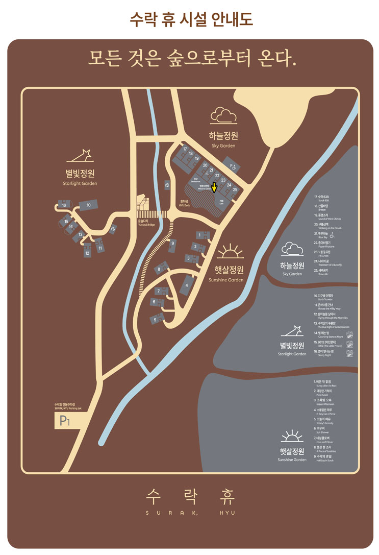 수락휴 자연휴양림의 모든 시설은 자연친화적 소재로 건축되었으며, 주변 환경과 조화를 이루도록 세심하게 설계되었습니다. 특히 트리하우스는 나무를 해치지 않고 건축한 친환경 구조물로, 자연 속에서의 특별한 숙박 경험을 제공합니다.