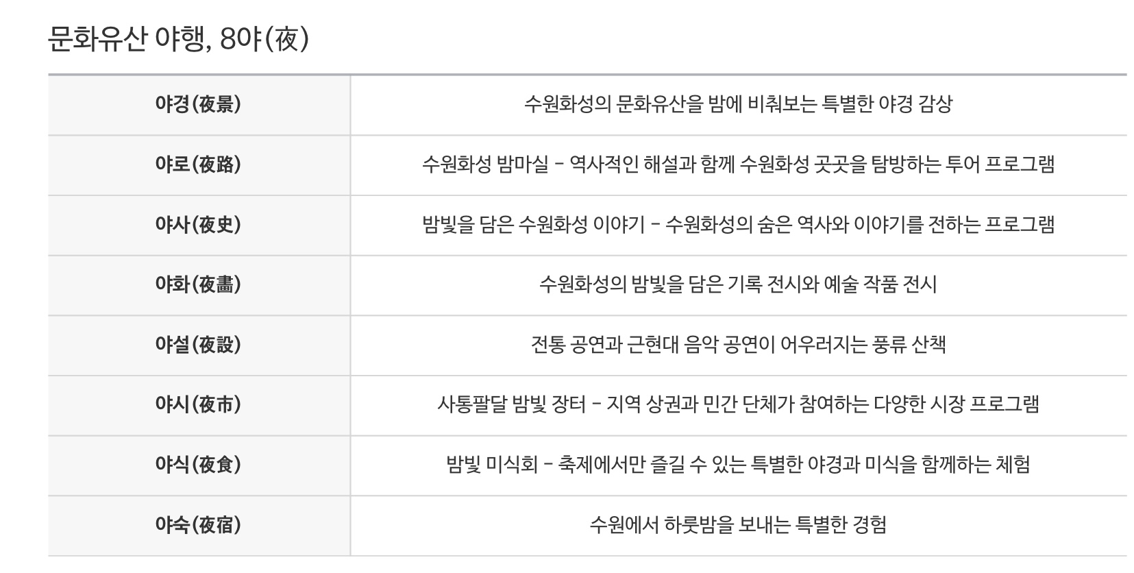 수원 국가유산 야행은 '8야(夜)'를 주제로 다양한 프로그램을 선보입니다. 각각의 프로그램은 수원의 풍부한 역사와 문화를 담고 있어 방문객들에게 특별한 경험을 선사합니다.