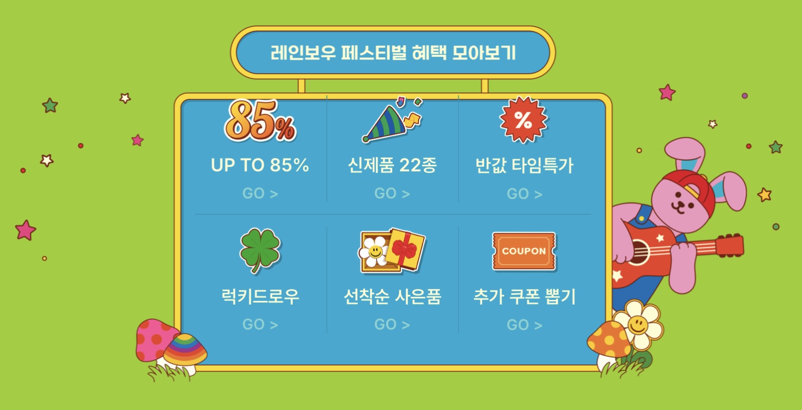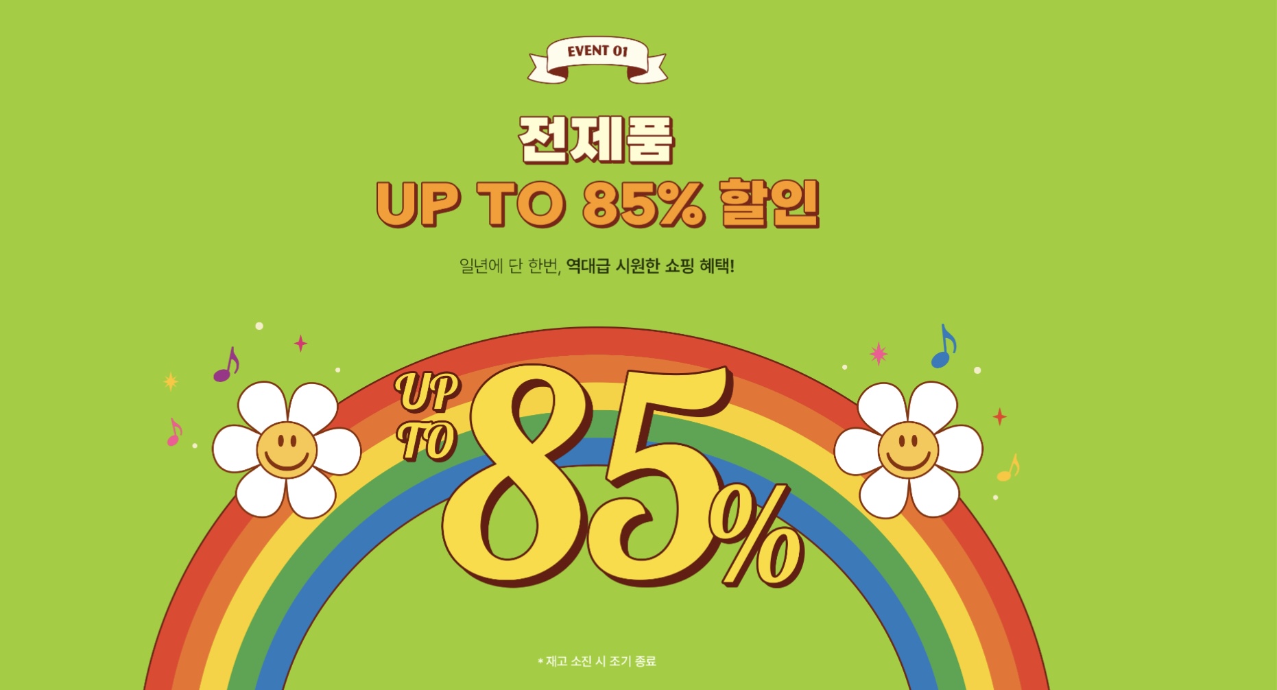 최대 85% 세일, 선착순 선물, 사은품 풀세트, 반값 타임특가, 럭키드로우, 추가 쿠폰까지 모두 준비되어 있어요.
