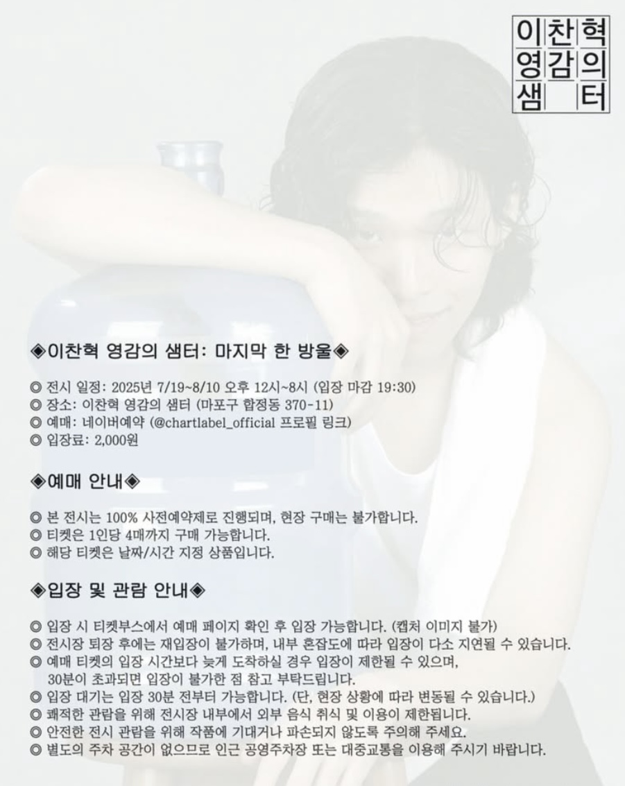 - 이찬혁 영감의 샘터 전시회는 시간당 입장 인원이 제한되어 있습니다.
