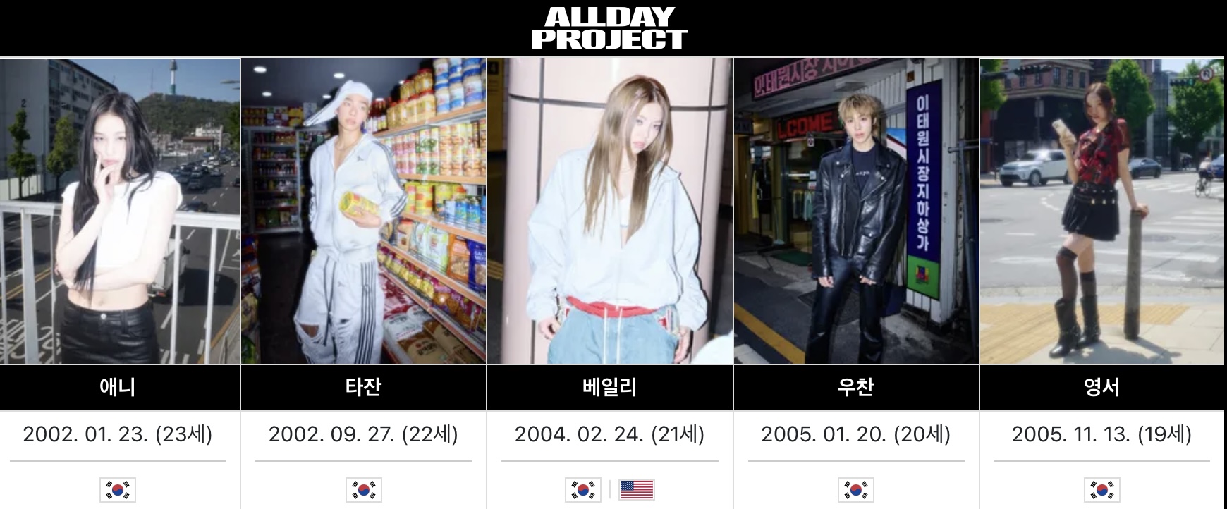 이처럼 ALLDAY PROJECT는 테디표 혼성 그룹의 역량과 신선함, 화제성을 고루 갖춘 팀입니다. 6월 23일 정식 데뷔 전까지 SNS에서 다양한 티징 무드와 퍼포먼스 영상이 풀릴 예정이니, 팬임을 인증하고 싶다면 지금부터 얼리 팔로우 강추입니다.
