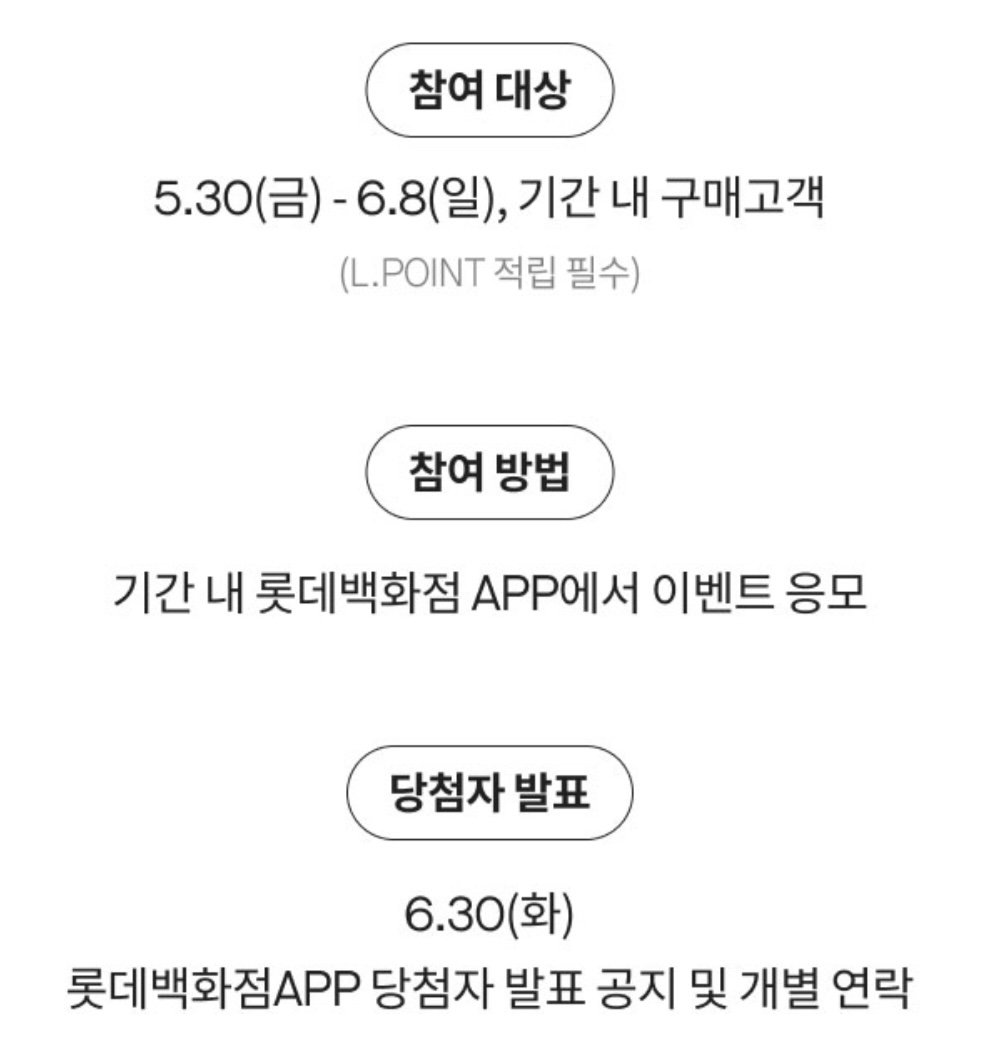 행사 기간 내 구매 고객이라면 누구나 응모 가능! 롯데백화점 앱을 통해 응모 시 총 200명을 추첨하여 푸짐한 경품 제공!