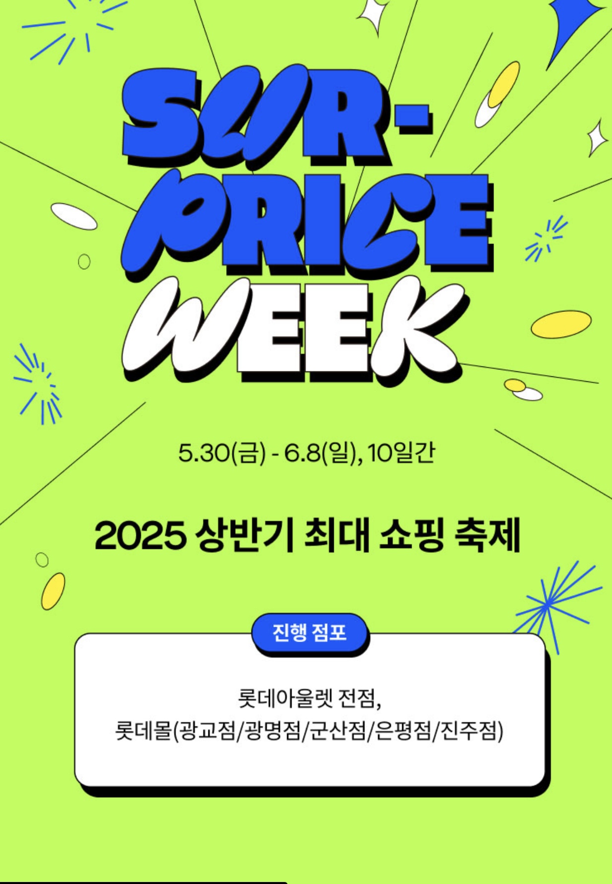 올해 상반기 가장 강력한 쇼핑 축제가 찾아왔습니다! 바로 2025 롯데아울렛 전점 ‘SUR-PRICE WEEK’! 브랜드별 초특가 할인, 럭키 드로우, 카드사 혜택까지 쇼핑족이라면 반드시 들러야 할 이유가 가득합니다.