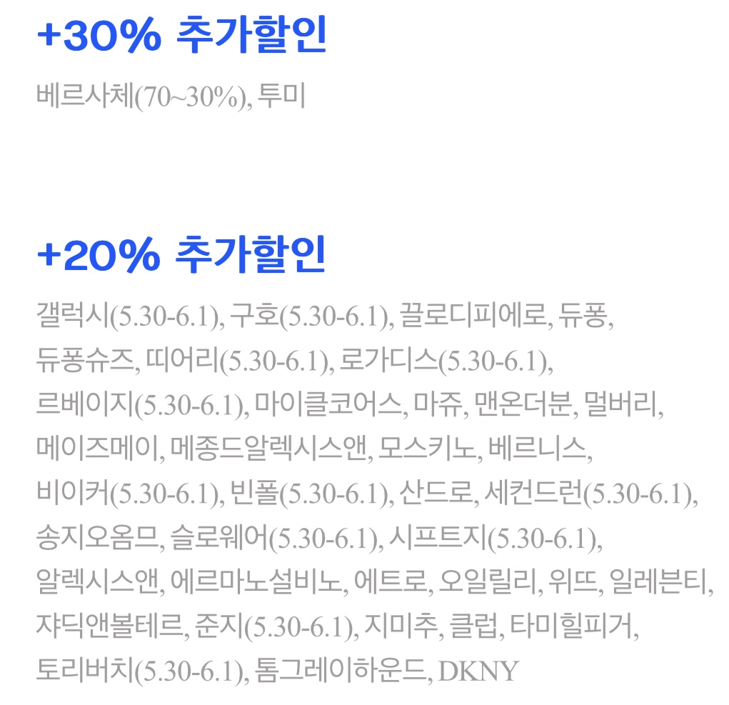 - 타미힐피거: 전 품목 20% 추가 할인 (5.30~6.8)