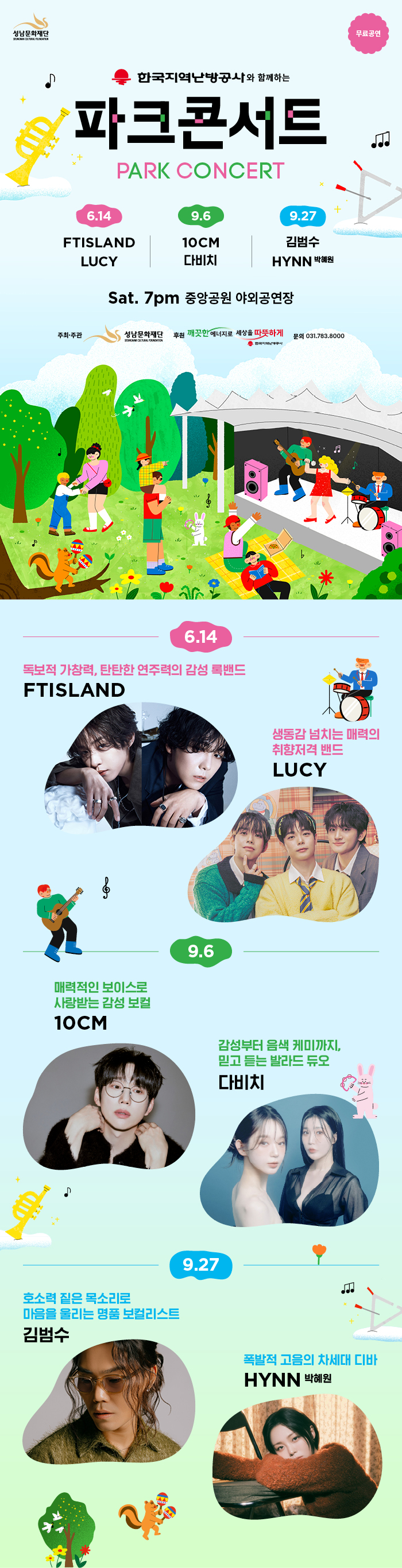 올해 한국지역난방공사 파크콘서트에는 다양한 장르의 최고 아티스트들이 출연합니다. 작년의 성공을 바탕으로 더욱 풍성해진 라인업을 확인해보세요!