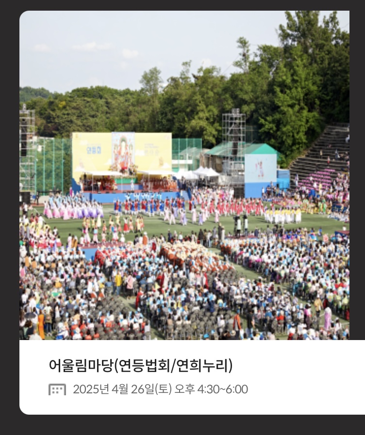 - 연등행렬: 4월 26일(토) 오후 7시, 동대문 → 종로 → 조계사