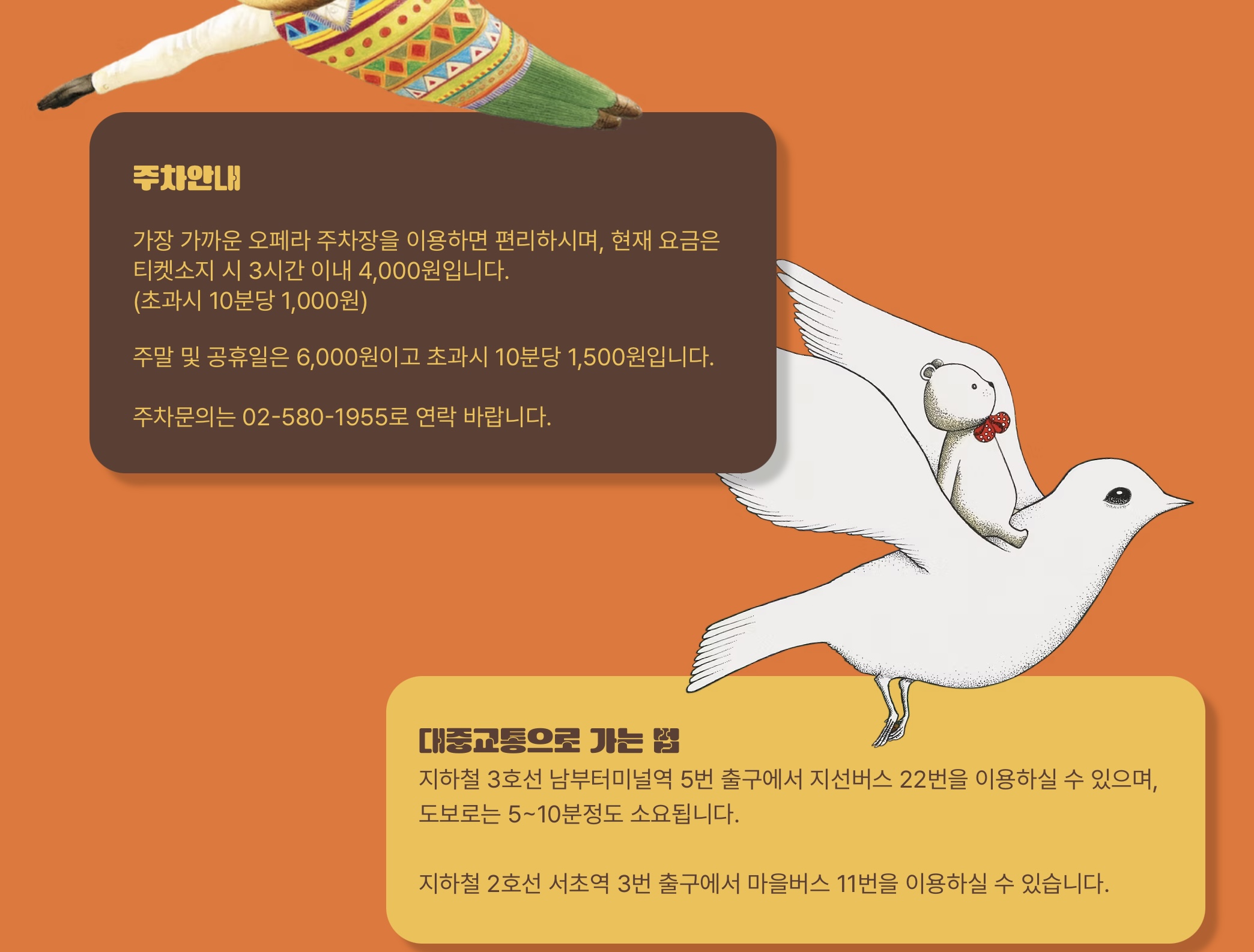 주차장 이용: 가장 가까운 주차장은 오페라 주차장이며 요금은 티켓소지시 3시간 이내엔 4,000원(주말엔 6,000원)