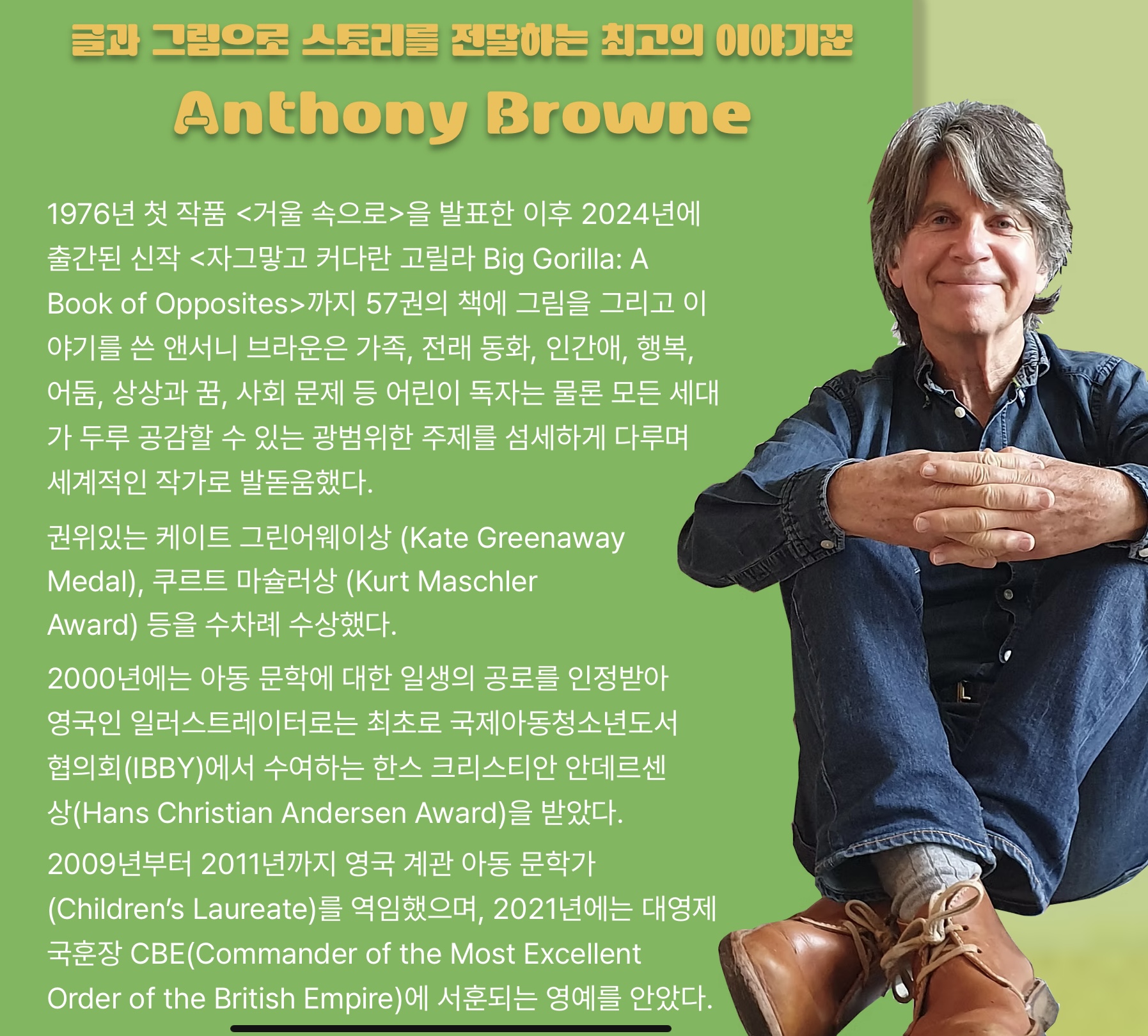 앤서니 브라운(Anthony Browne)은 1946년 영국에서 태어난 세계적인 그림책 작가로, 케이트 그린어웨이상과 한스 크리스티안 안데르센상을 수상한 대표적인 현대 그림책 작가입니다. 그의 작품은 현실과 상상이 절묘하게 어우러진 독특한 화풍과 깊이 있는 스토리텔링으로 전 세계 독자들에게 사랑받고 있습니다.