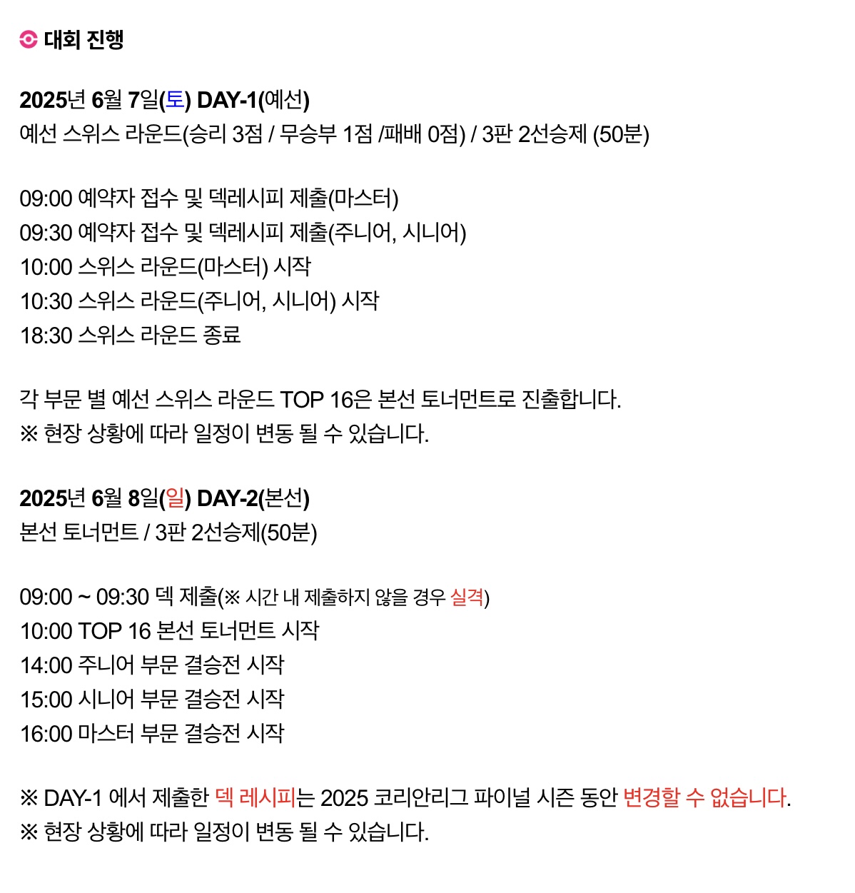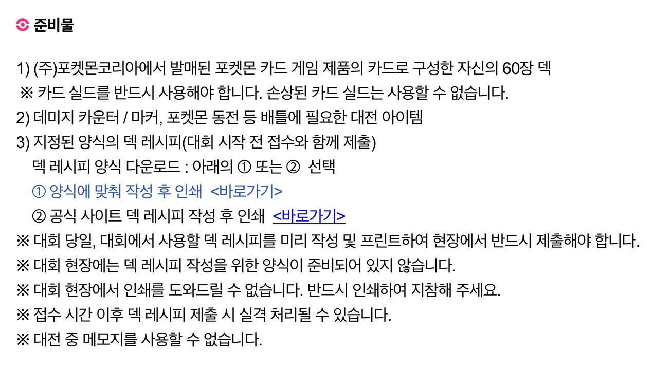 - 소지품 점검: 대회 참가자는 필요한 장비(카드 덱, 게임기 등)를 반드시 지참하세요.