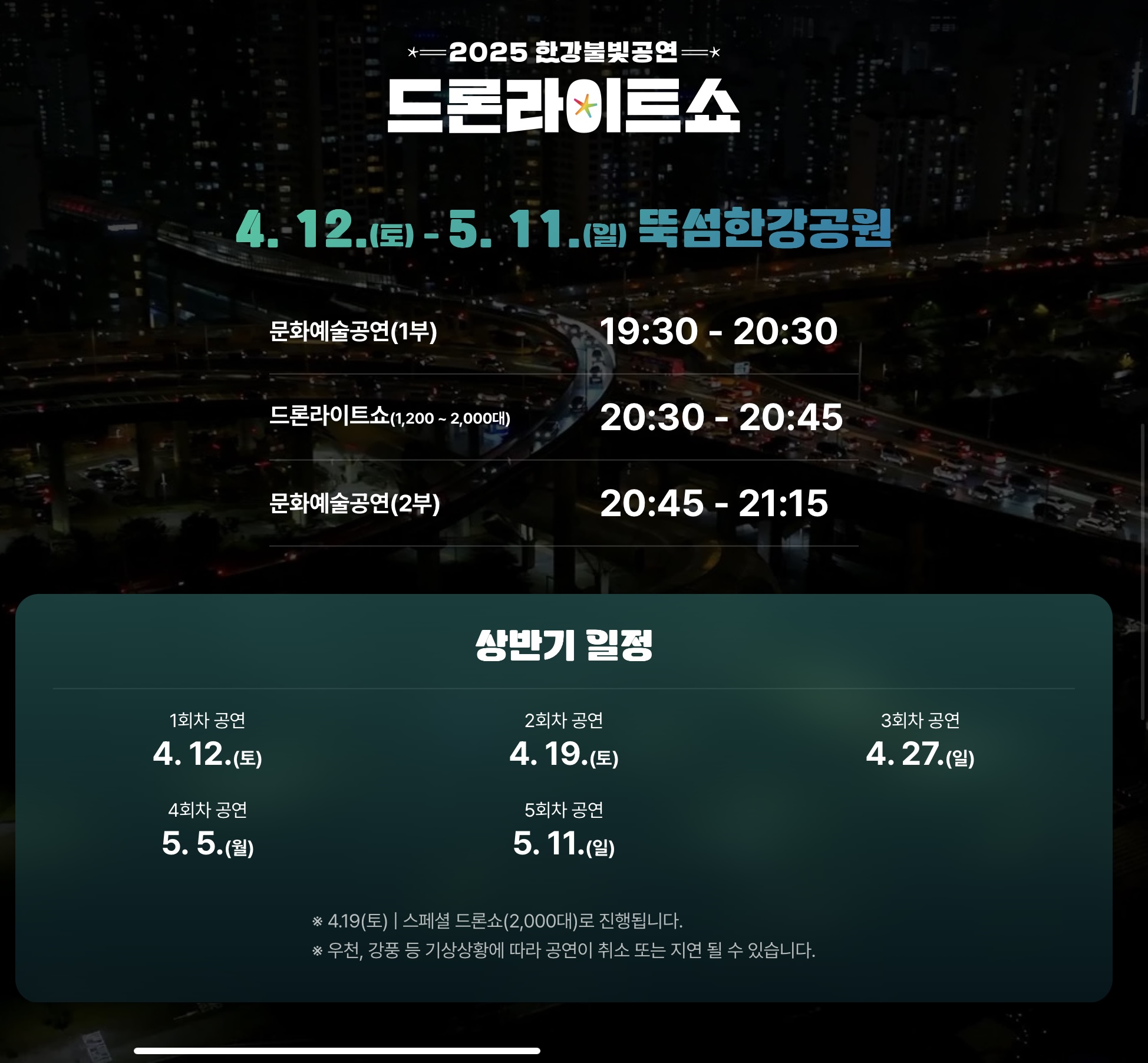 한강의 봄밤이 특별해지는 순간! 바로 2025 한강 드론라이트쇼입니다. 매년 많은 사람들이 기다리는 이 멋진 야간 축제가 올해는 더욱 화려해진 드론 퍼포먼스로 돌아왔어요.
