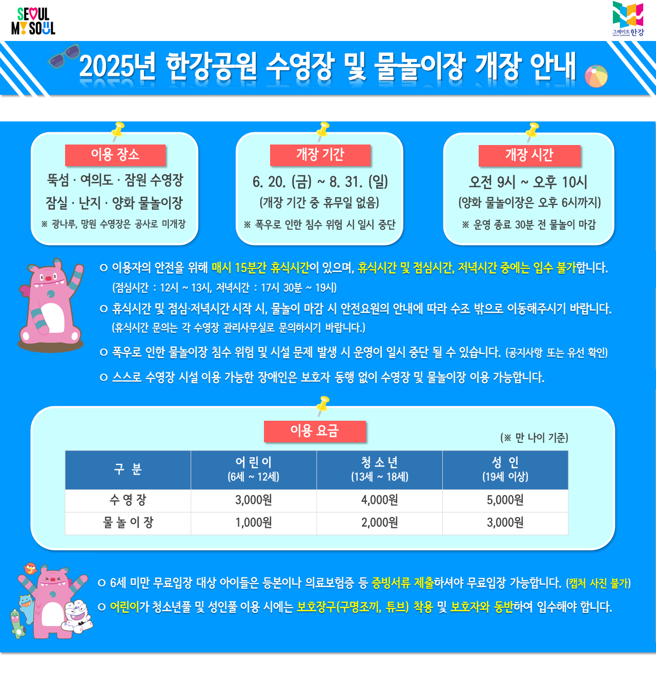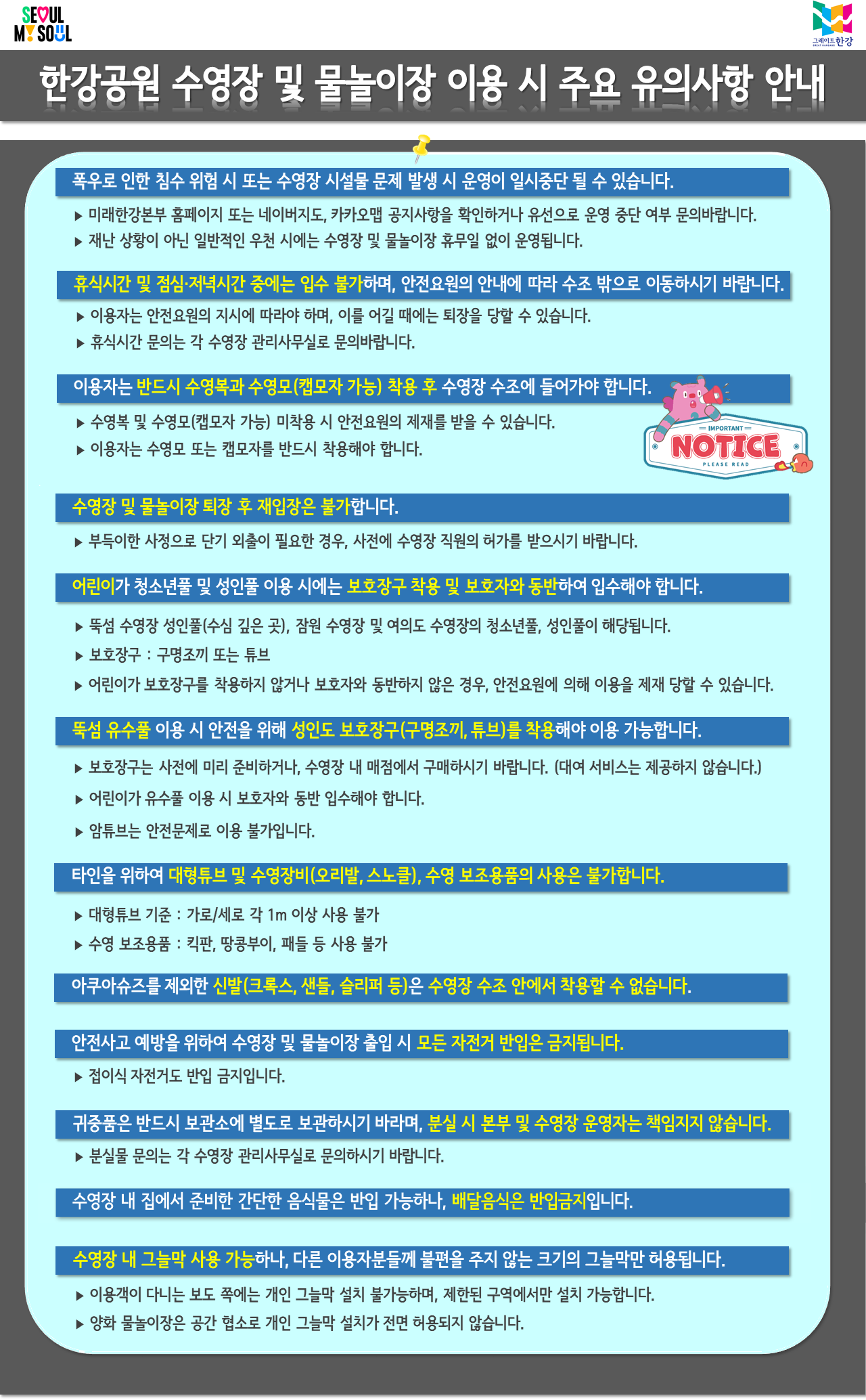 한강공원 수영장/물놀이장 이용 시 반드시 지켜야 할 주의사항들입니다: